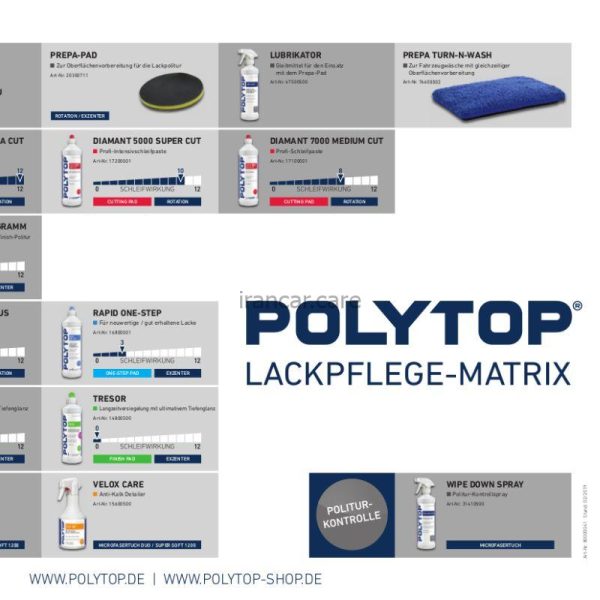 مانند سایر پولیش رنگ بدنه خودرو، توصیه می شود دستورالعمل های سازنده را دنبال کرده و با دستگاه پولیش استفاده کنید. پیشنهاد کمپانی تولید کننده پلی تاپ Polytop آلمان در مرحله دوم از پولیش نرم بدنه خودرو پلی تاپ POLYTOP Reflex، برای دستیابی به یک روکش براق بالا و پایان کار استفاده کنید.
