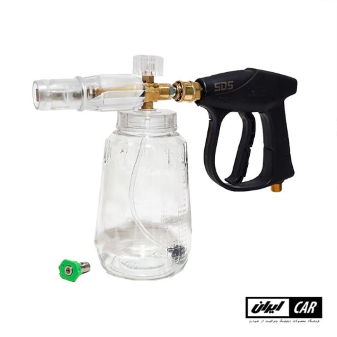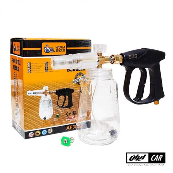 تفنگی کف پاش فوم بادی مدل wuka sds gun foam داری یک نازل پاشش آب می باشد که به راحتی آن را به گان وصل کرده و بعد از پاشش شامپو و کف می توانید خودروی خود را آبکشی کنید.